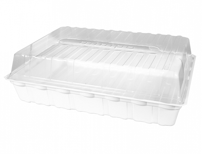 Zawartość opakowania: Solidne dno z tworzywa sztucznego z otworami drenażowymi, półprzezroczysta pokrywa z regulowaną wentylacją.