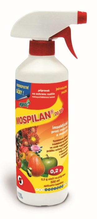 Sposób użycia: Dodać wodę do butelki z rozpylaczem zawierającej saszetkę Mospilan do kreski (500 ml). Dokładnie wstrząsnąć, aż saszetka całkowicie się rozpuści. Dokładnie spryskać zainfekowane części rośliny, w tym spodnią stronę liści, otrzymanym roztworem. Stosować przy pierwszych oznakach zakażenia, najlepiej wieczorem lub wczesnym rankiem, z dala od bezpośredniego światła słonecznego. Dla uzyskania maksymalnego efektu, powtórzyć zabieg po 7-14 dniach. Produkt można stosować na roślinach ozdobnych, warzywach i drzewach owocowych. Okres karencji wynosi 3-28 dni w zależności od gatunku rośliny.