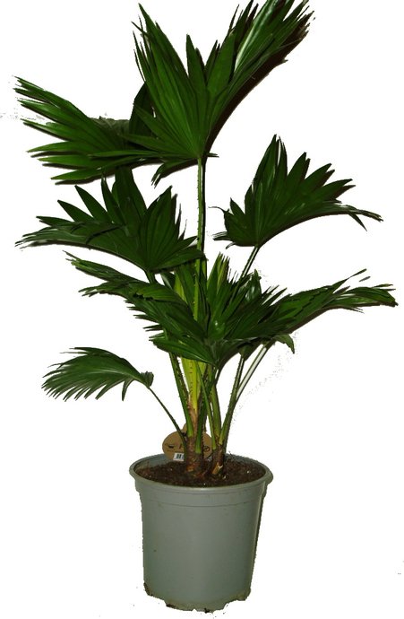 Palma rotundifolia (Livistona rotundifolia). Roślina ma około 120 cm wysokości. Średnica doniczki wynosi około 24 cm. Livistona lubi dużo światła, nie przeszkadza jej bezpośrednie nasłonecznienie. Latem można ją wystawiać na zewnątrz. Zimą wystarczająca jest temperatura 12-14°C, ale starsze rośliny wytrzymują mrozy do -5°C. Zdjęcie poglądowe.