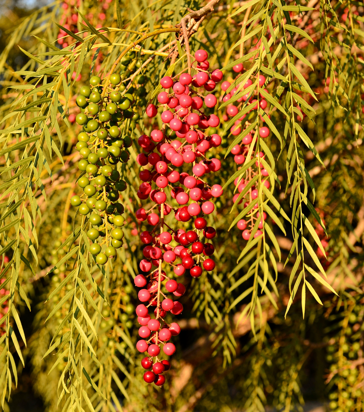 Schinus molle, znany również jako peruwiański pieprznik, peruwiańskie drzewo mastyksowe lub fałszywy pieprz, to fascynujące, szybko rosnące, wiecznie zielone drzewo lub krzew z rodziny adenowatych, pochodzące z Andów. Przyciąga uwagę elegancko zwisającymi gałęziami z delikatnymi, jasnozielonymi, pierzastymi liśćmi przypominającymi wierzbę lub bambus, przyjemnie pachnącymi żywicą i pieprzem po roztarciu, małymi kremowobiałymi lub żółtawymi kwiatami zebranymi w gęste wiechy, a przede wszystkim pięknymi gronami małych, okrągłych owoców, początkowo zielonych, a następnie dojrzewających do intensywnego różowo-czerwonego koloru, przypominających koraliki lub małe wiśnie o charakterystycznym żywicznym aromacie i smaku pieprzu. Owoce pospolitego pieprznika są znane na całym świecie jako różowy pieprz lub pieprz peruwiański i są wykorzystywane w gastronomii jako przyprawa. Pieprznik jest jednym z najbardziej eleganckich i dekoracyjnych drzew subtropikalnych, odpowiednich do środkowoeuropejskich ogrodów zimowych i tarasów. Zdjęcie ilustracyjne.